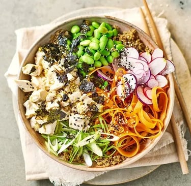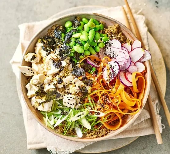 Kinoayı kaselere paylaştırın ve üzerine edamame, turp ve havuçları koyun. Üzerine tofuyu dökün ve kalan sosu gezdirdikten sonra üzerine yeşil soğan, deniz yosunu ve susam tohumlarını serpin.